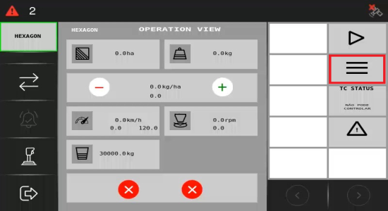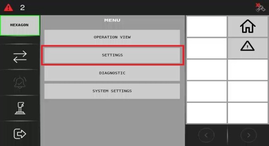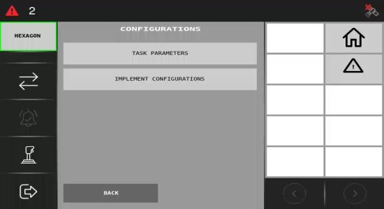 Once you access the Settings menu, you can access and define the Task parameters or adjust the Implement configuration.