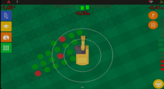 Lightbar: Positioned at the top and right-hand side of the operation screen, the lightbar indicates the excavator's deviation from the target in progress. The side lightbar represents the longitudinal distance to the target, while the top lightbar denotes the lateral distance. The illuminated squares correspond to LEDs that activate upon reaching the configured offset, visually signaling the deviation direction (right or left). The operator can adjust the sensitivity, in meters, for the five central position LEDs.